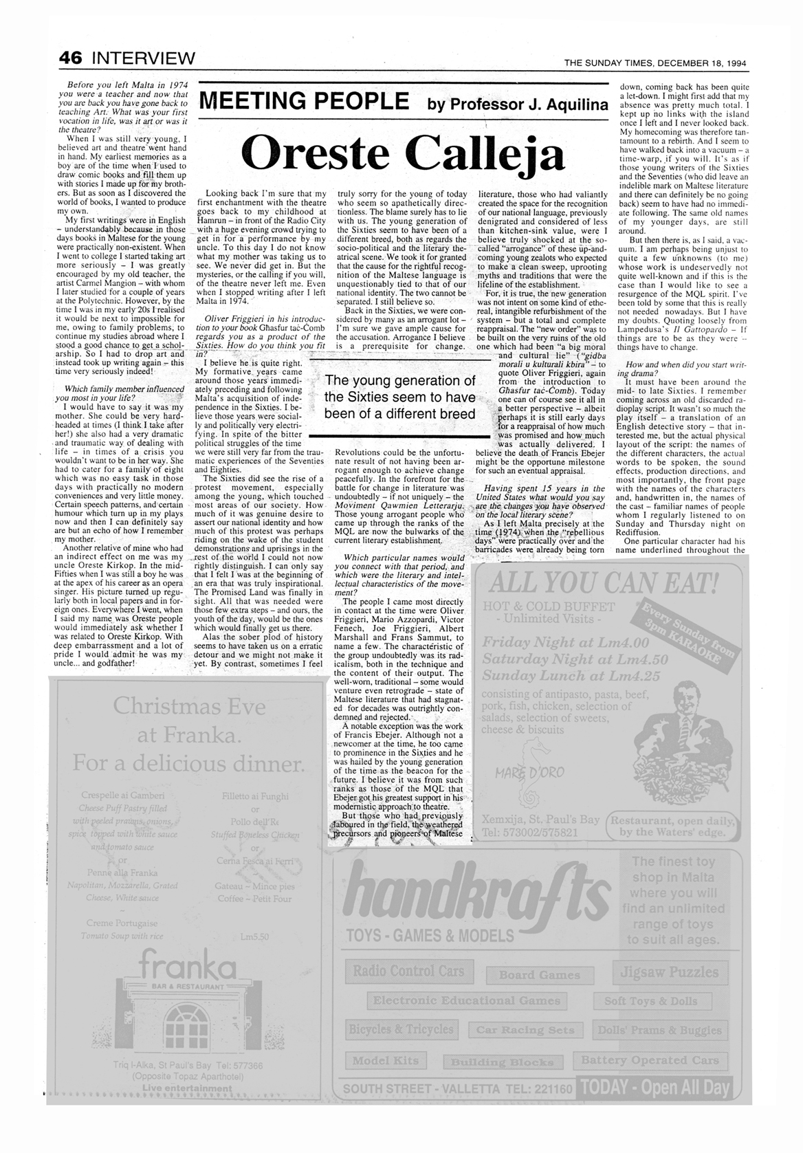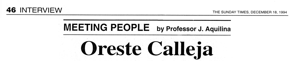 Prof. J. Aquilina - Interview MEETING PEOPLE: ORESTE CALLEJA THE SUNDAY TIMES - December 18, 1994