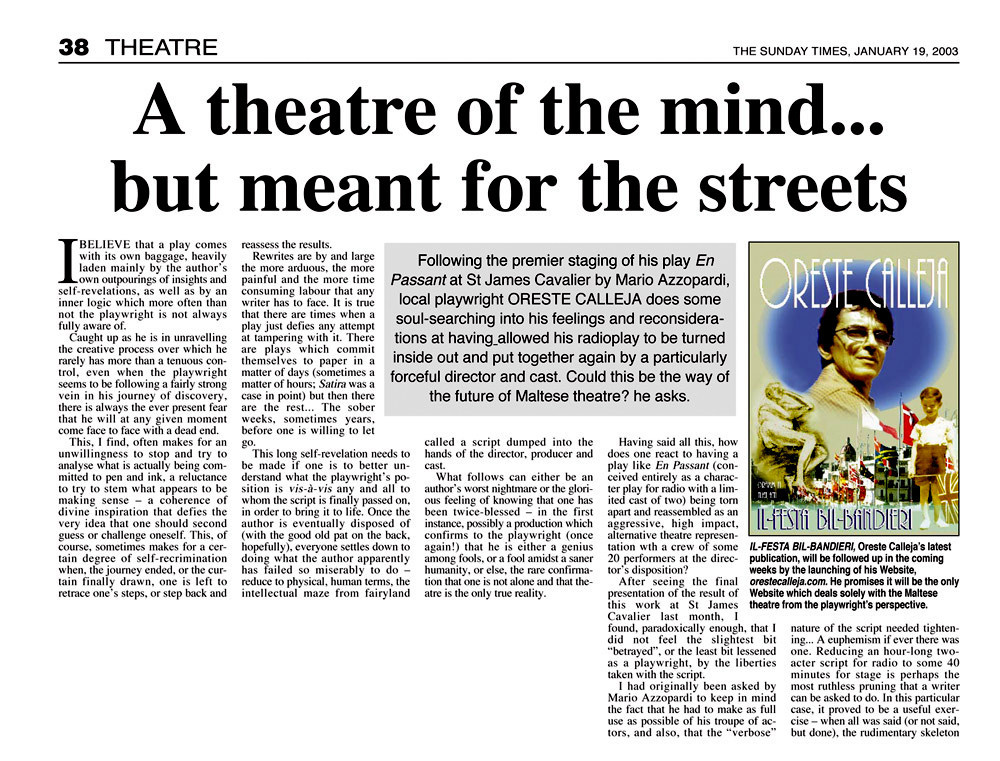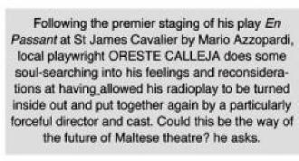 close sync with what the script called for. To my mind, as long as there is an honest reading into the content of a play, a director cannot go wrong. As long, naturally, as the director and supporting cast do in fact believe in the script, which they start with. As it is, from the handing over of the script to the first night of the play, I did not participate in the work. Neither did I feel the need to do so. In a way, once I did pare down the script to practically a “canavaccio’, I felt somehow relieved of the responsibility for what was to follow. Somehow I felt the responsibility shifted squarely onto the producer’s and the actors’ shoulders. In this particular play I was not the least bit sorry to have done so. The end result far surpassed my expectations. Still one has to wonder, what are the possibilities of going a step further and creating the space for a theatre were the final product is neither the faithful re-production of a play (a script by one particular author) nor the ensemble spectacle generated by a theatrical collective where theatre comes with a capital T? Speaking as a playwright I do admit that I have practically always been left with a sense of assisting to something that somehow is not quite cohesive winner. I do attend to this type of Theatre – at least locally. My prejudiced instinct tells me that this “anonymous” production by a collective is more often than not too loose, sometimes incomplete, – the focus of too many ideas from too many input sources appear to me to somehow never quite find a common target – a central unifying point of vision. This clamour for attention from too many sources can be deafening – distracting to say the least. Is this the inevitable result of the democratic impulse to try to let everybody have an equal input into the creative process? Is it because, having dispensed with an author, one must make sure that the finished work must not bear the imprint of any single creative source? What Azzopardi put together in En Passant I believe was the result of a quite strong personal vision of the producer – although one must make allowances for the input from the performers themselves. Considering the current crucial time of reassessment that the local theatrical scene is going through today, one has to wonder if the collaborative effort of writers and directors and performers can somehow be put to better use than it has been put to date. It is said that in America, the focus of native theatre identifies itself more closely with the playwright and his vision, whereas in England the work of a collective seems to predominate. Could a formula, a modus vivendi and modus operandi be found through which Maltese theatre could be better served than it has been served to date? Speaking from the playwrights point of view, although I am extremely jealous that once I have produced a script, it should not be tampered with lightly, yet one is equally aware that the hit or miss way of staging a new play in Maltese today is hardly conducive to a strategy that allows for a, either the playwright re-think and better adopt the script to the necessities of the theatre, nor for the directors to take the time to read too deeply into the sub-text. The current pathetic short term of preparation before a theatrical production, plus the equally pathetic short run of a play, two or three nights max, leads me to believe that a) either whoever chooses to produce the play has to have the full conviction and ardent wish to stage it with an almost god-like belief in the creator of the script and interprets it faithfully (as is the case whenever a foreign play in a foreign language is staged, in deference to the foreign “master” playwright), or the author must resign himself to give up total control of the script and rely on the final better judgement of the producer, director and cast. Time being the limiting factor the concept of a work in progress, meaning a collaborative effort between scriptwriters and performers, is effectively non-existent locally. And yet I strongly believe that given the right conditions it could be an ideal way bringing new work to the Maltese stage.