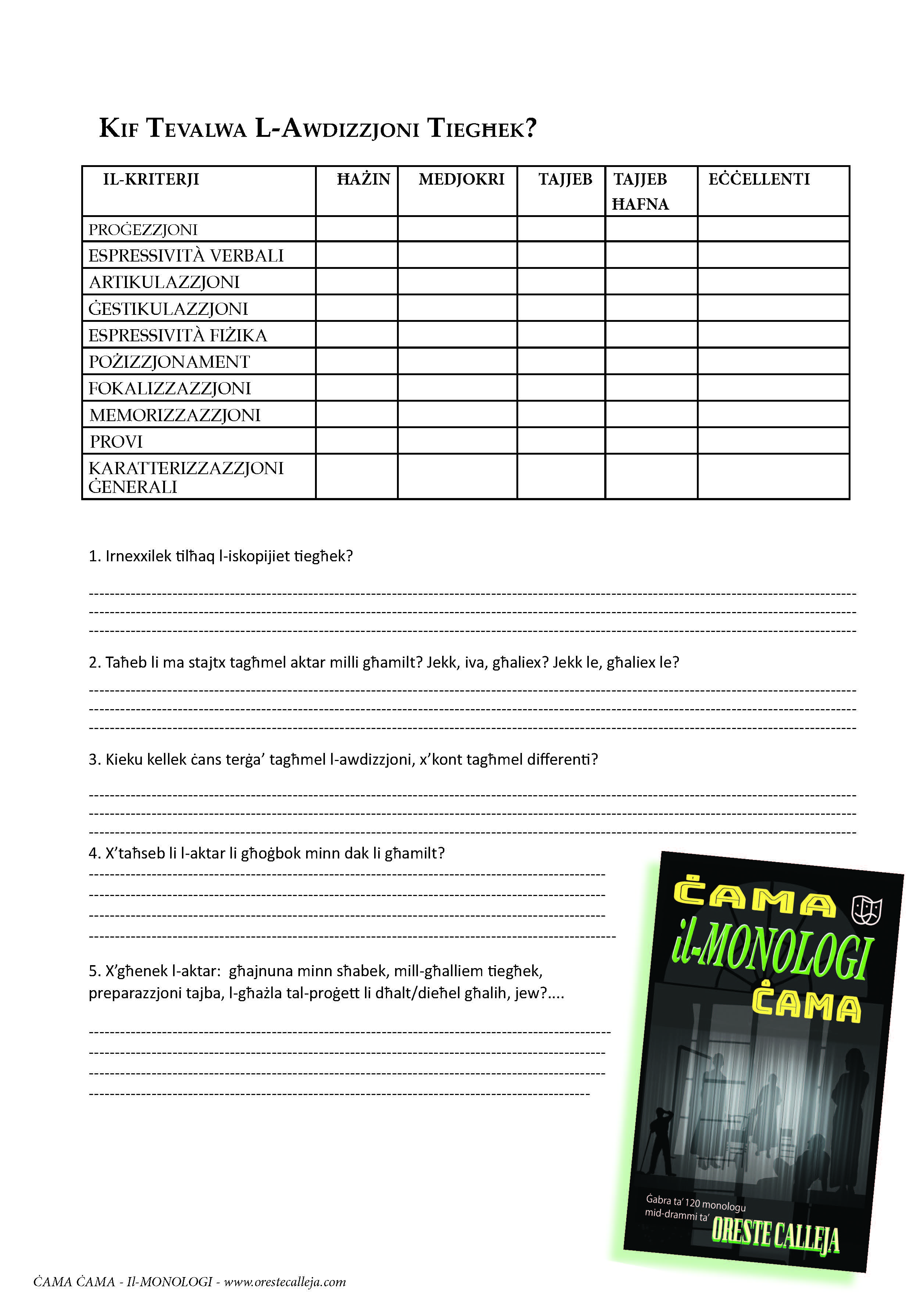 Fajl ieħor (fuq il-lemin hawnhekk) jista' jkun utli għal min ikun jixtieq jaqgħmel evalwazzjoni personali ta' wara dwar l-andament ta' awdizzjoni li jkun għamel.