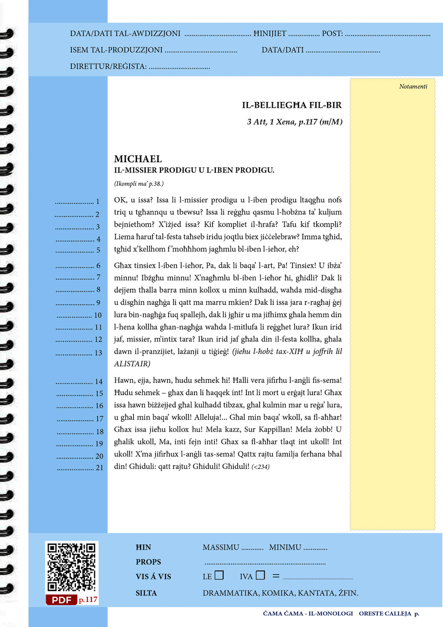 Stampar ta' kopja ta' monologu. Kopja ta' monologu partikolari individwali magħżul biex jintuża għal skopijiet ta' studju jew bi tħejjija għal awdizzjoni jista' jitniżżel jew jiġi stampat mis-sit tal-internet tal-awtur mill-paġna dedikata għall-monologi. http://www.orestecalleja.com/MonologiHawnhekk issib paġna dedikata għal kull monologu individwali, imsawra b'tali mod li meta tiġi stampata tkun faċli li tinqara u tħalli spażju għal notamenti li jistgħu jkunu meħtieġa għall-preparazzjoni jew forsi biex tagħmel evalwazzjoni ta' wara ta' kif marret l-awdizzjoni. Hemm inkluż ukoll link għat-test sħiħ tad-dramm. Il-QR code tal-monologi individwali jwassal dirett għal din il-paġna. Il-ħidma t-tajba!
