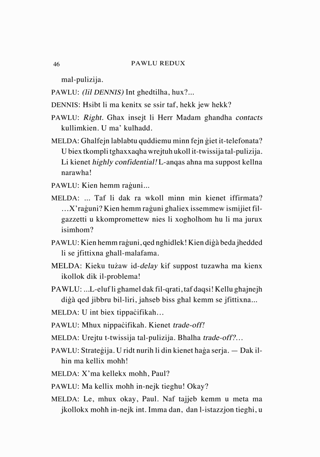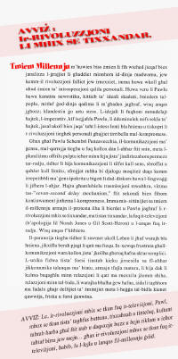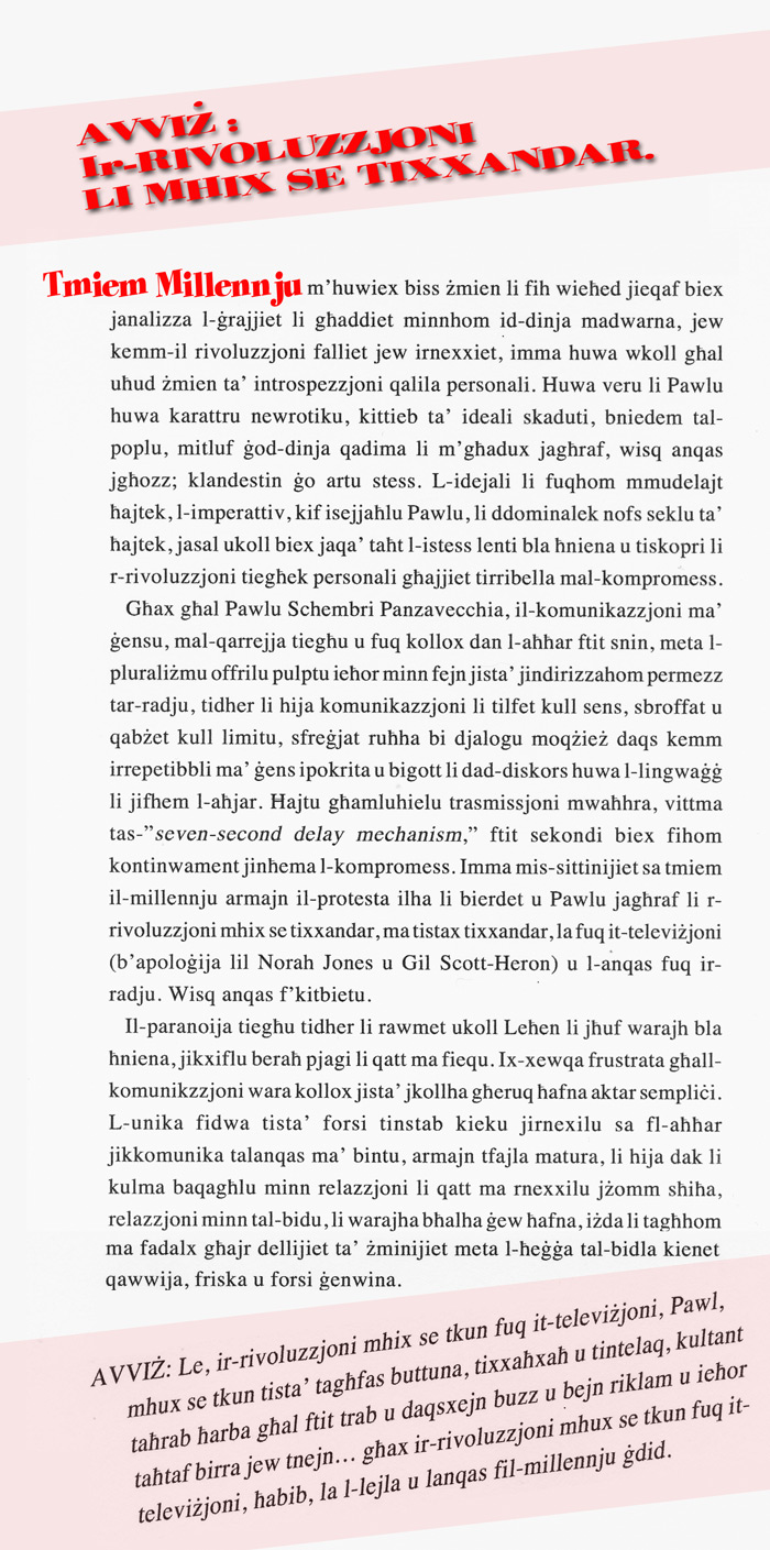Tmiem millennju m'huwiex biss żmien li fih wieħed jieqaf biexjanalizza l-ġrajjiet li għaddiet minnhom id-dinja madwarna, jew kemm-ilrivoluzzjoni falliet jew irnexxiet, imma huwa wkoll, għal uħud, żmien ta' introspezzjoni qalila personali. Huwa veru li Pawlu huwa karattru newrotiku,kittieb ta' ideali skaduti, bniedem tal-poplu, mitluf f'dinja qadima li m'għadux jagħraf, wisq anqas jgħożż: klandestin ġo artu stess. L-ideali li fuqhom immudellajt ħajtek, l-imperattiv, kif isejjaħlu Pawlu, li ddominalek nofs seklu ta' ħajtek, jasal ukoll biex jaqa' taħt l-istess lenti bla ħniena, u tiskopri li r-rivoluzzjoni tiegħek personali għejiet tirribella kontra l-kompromess.Għax għal Pawlu Schembri Panzavecchia, il-komunikazzjoni ma' ġensu, mal-qarrejj tiegħu, u fuq kollox dan laħħar ftit snin metal-pluraliżmu offrilu pulptu ieħor minn fejn jista' jindirizzahom permezz tar-radju, tidher li hija komunikazzjoni li tilfet kull sens, sbroffat u qabżet kull limitu, sfreġjat ruħha fi djalogu moqżież daqs kemm irrepetibbli ma' ġens ipokrita u bigott li dad-diskors huwa l-lingwaġġ li jifhem l-aħjar. ħajtu għamluhielu trasmissjoni mwaħħra, vittma tad-delay mechanism, ftit sekondi misruqa biex fihom kontinwament jinħema l-kompromess. Imma mis-sittinijiet sa tmiem il-millennju armajn, il-protesta ilha li birdet, u Pawlu jagħraf li r-rivoluzzjoni mhix se tixxandar, ma tistax tixxandar, la fuq it televiżjoni (b'apoloġija lil Norah Jones u Gil Scott-Heron.) u lanqas fuq ir-radju. Wisq anqas f'kitbietu. |