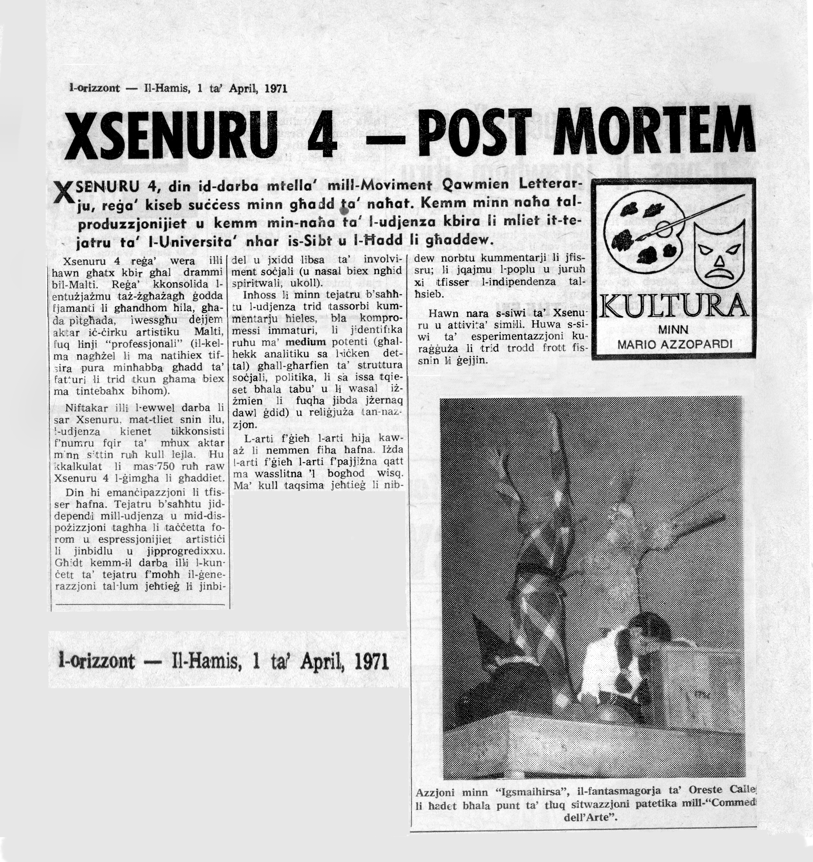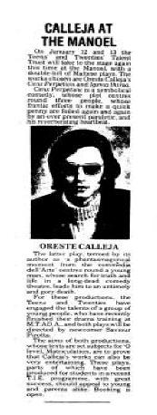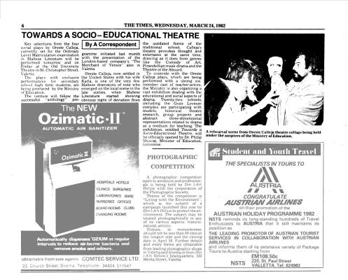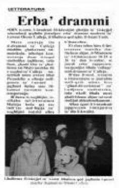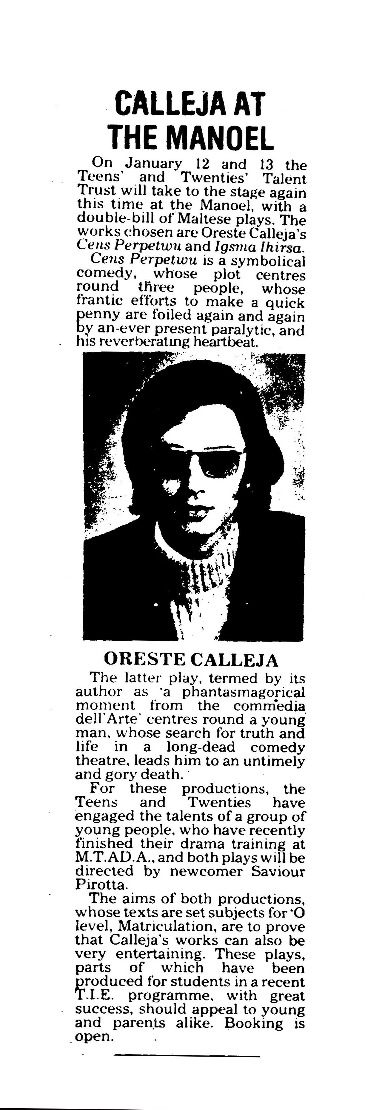 CALLEJA AT THE MANOEL On January 12 and 13 the Teens and Twenties Talent Trust will take to the stage again, this time at the Manoel, with a doublebill of Maltese plays. The works chosen are Oreste Calleja's Cens Perpetwu and Igmsaihirsa. Cens Perpetwu is a symbolical comedy, whose plot centers round three people, whose frantic efforts to make a quick penny are foiled again and again by an ever present paralytic, and his reverberating heartbeat. The latter play, termed by its author as a " phantasmagorical moment from the "Commedia dell'Arte' centers round a young man whose search for truth and life in a long-dead comedy theatre, leads him to an untimely and gory death. For these productions, the Teens and Twenties have engaged the talents of a group of young people who have recently finished their drama training at M.T.AD.A. and both plays will be directed by newcomer Saviour Pirotta. The aims of both productions, whose texts are set subjects for O level, Matriculation, are to prove that Calleja's works can also be very entertaining. These plays, parts of which have been produced for students in a recent T.I.E. programme with great success, should appeal to young and parents alike. Booking is open. |