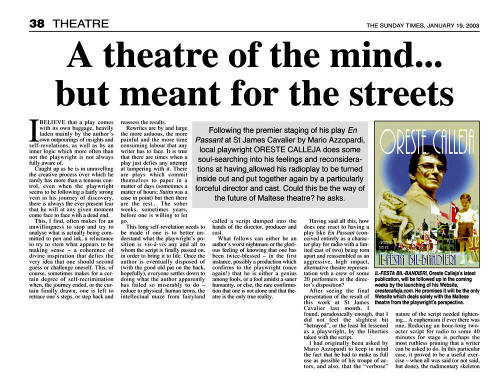 close sync with what the script called for. To my mind, as long as there is an honest reading into the content of a play, a director cannot go wrong. As long, naturally, as the director and supporting cast do in fact believe in the script, which they start with. As it is, from the handing over of the script to the first night of the play, I did not participate in the work. Neither did I feel the need to do so. In a way, once I did pare down the script to practically a “canavaccio’, I felt somehow relieved of the responsibility for what was to follow. Somehow I felt the responsibility shifted squarely onto the producer’s and the actors’ shoulders. In this particular play I was not the least bit sorry to have done so. The end result far surpassed my expectations. Still one has to wonder, what are the possibilities of going a step further and creating the space for a theatre were the final product is neither the faithful re-production of a play (a script by one particular author) nor the ensemble spectacle generated by a theatrical collective where theatre comes with a capital T? Speaking as a playwright I do admit that I have practically always been left with a sense of assisting to something that somehow is not quite cohesive winner. I do attend to this type of Theatre – at least locally. My prejudiced instinct tells me that this “anonymous” production by a collective is more often than not too loose, sometimes incomplete, – the focus of too many ideas from too many input sources appear to me to somehow never quite find a common target – a central unifying point of vision. This clamour for attention from too many sources can be deafening – distracting to say the least. Is this the inevitable result of the democratic impulse to try to let everybody have an equal input into the creative process? Is it because, having dispensed with an author, one must make sure that the finished work must not bear the imprint of any single creative source? What Azzopardi put together in En Passant I believe was the result of a quite strong personal vision of the producer – although one must make allowances for the input from the performers themselves. Considering the current crucial time of reassessment that the local theatrical scene is going through today, one has to wonder if the collaborative effort of writers and directors and performers can somehow be put to better use than it has been put to date. It is said that in America, the focus of native theatre identifies itself more closely with the playwright and his vision, whereas in England the work of a collective seems to predominate. Could a formula, a modus vivendi and modus operandi be found through which Maltese theatre could be better served than it has been served to date? Speaking from the playwrights point of view, although I am extremely jealous that once I have produced a script, it should not be tampered with lightly, yet one is equally aware that the hit or miss way of staging a new play in Maltese today is hardly conducive to a strategy that allows for a, either the playwright re-think and better adopt the script to the necessities of the theatre, nor for the directors to take the time to read too deeply into the sub-text. The current pathetic short term of preparation before a theatrical production, plus the equally pathetic short run of a play, two or three nights max, leads me to believe that a) either whoever chooses to produce the play has to have the full conviction and ardent wish to stage it with an almost god-like belief in the creator of the script and interprets it faithfully (as is the case whenever a foreign play in a foreign language is staged, in deference to the foreign “master” playwright), or the author must resign himself to give up total control of the script and rely on the final better judgement of the producer, director and cast. Time being the limiting factor the concept of a work in progress, meaning a collaborative effort between scriptwriters and performers, is effectively non-existent locally. And yet I strongly believe that given the right conditions it could be an ideal way bringing new work to the Maltese stage.
