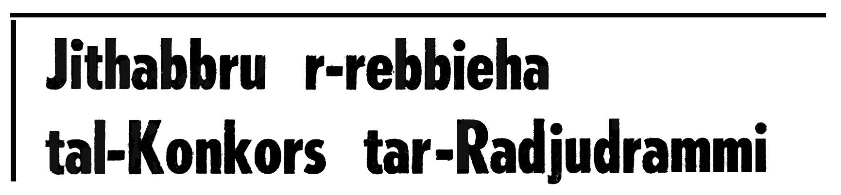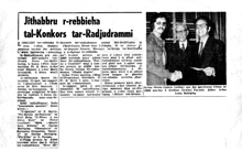 L-ismijiet tar-rebbieħa fil-Konkors tar-Radjudrammi mniedi mir-Rediffusion is-sena l-oħra tħabbru f'Rediffusion House nhar il-Ġimgħa, 18 ta' Jannar fil-preżenza tas-Sur Joe Avellino, id-Deputat General Manager tal-Grupp tar-Rediffusion li wkoll ippreżenta l-premjijiet u d-diplomi lir-rebbieħa. lr-radjudrammi ġew eżaminati mill-membri tad-Drama Panel tar-Rediffusion, li huma l-Prof. Gużè Aquilina, Fr. H. Born, is-Sur Gużè Diacono u s-Sur Mario Azzopardi, li kienu wkoll preżenti. Iċ-ċerimonja kienet tikkonsisti fil-qari tar-rapport tal-eżaminaturi u l-ftuħ minn Dr. Eric Sammut, l-Avukat tal-kumpanija, ta l-envelopes issiġġillati bl-ismijiet tal-awturi li kienu jikkorrispondu man-nom-de-plume. Seba' radjudrammi ħadu "honourable mention". |